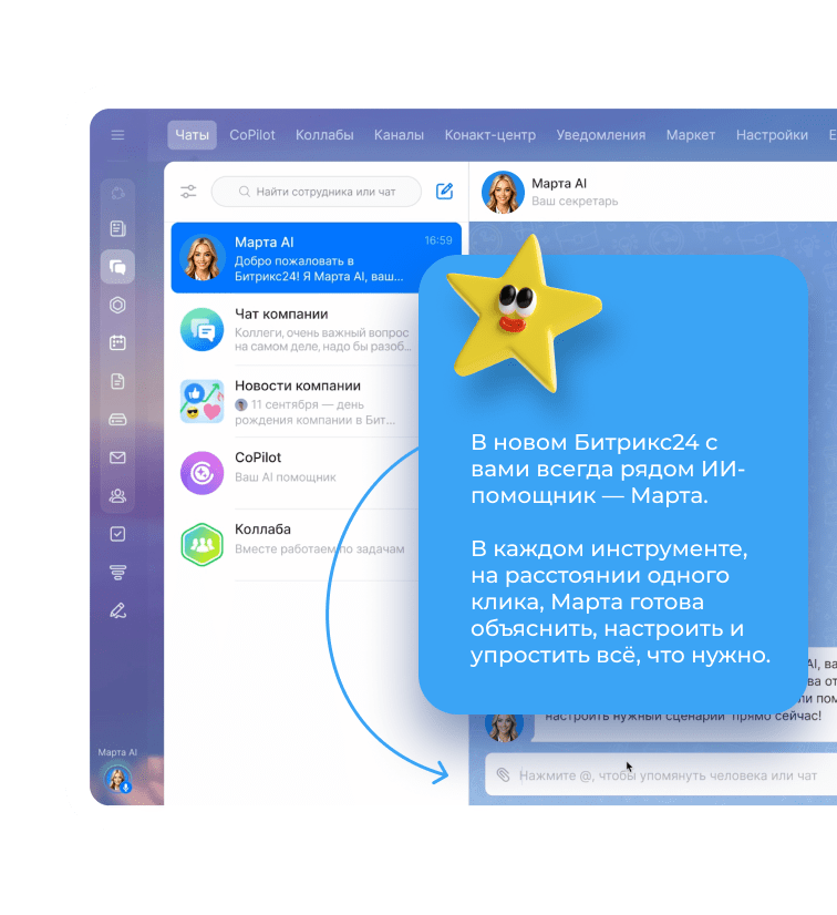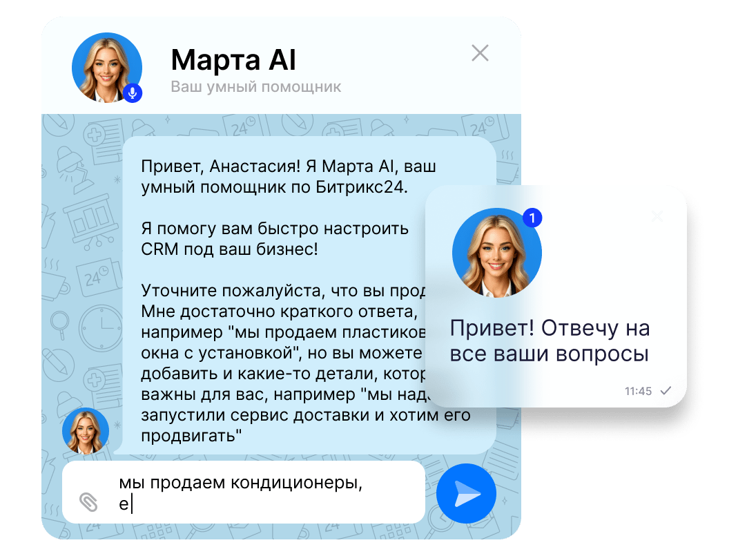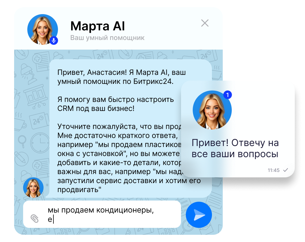 Не нужно разбираться и тратить время, Марта всё сделает за вас. Пара минут и вы получите готовую CRM-систему, идеально адаптированную под ваш бизнес. А если возникнут вопросы, Марта всегда готова помочь.